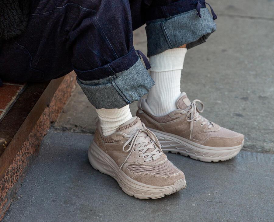 The Hoka X Eg Bondi L features a low-profile cushion bed that keeps your foot closer to the ground. and utilizes a firmer material designed to provide an efficient push-off.
